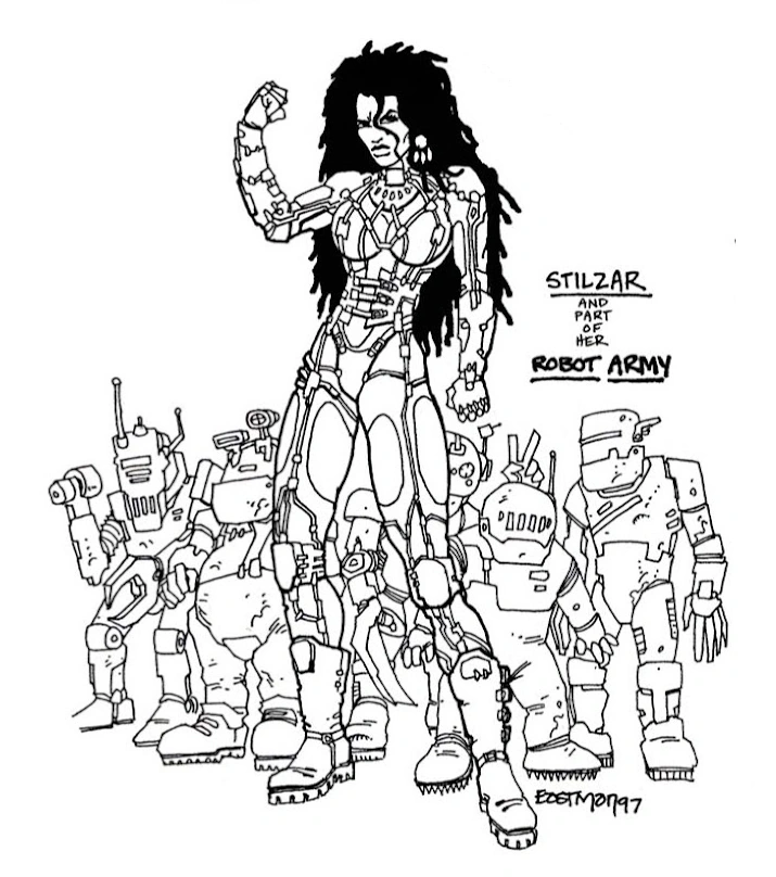 Stilzar was a character planned for Ninja Turtles: The Next Mutation, who went unused. She would have been a cyborg antagonist who commanded a robot army, and an empress of an alternate dimension. She was planned to have been portrayed by Kevin Eastman's wife at the time, supermodel and actress Julie Strain.