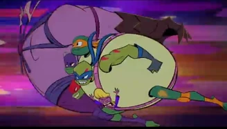 A flashback ends with annoyed Donnie asks Raph to press the red button, which the Shell Hogs appear, but only two of them. The turtles are forced to aboard two of them as they ride on them to the museum.