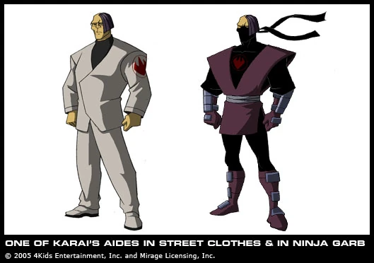 One of Karai's aides from the 2003 TV series, he appears in the City at War episodes where he plants a bomb on a water tower and helps Karai fight the turtles, Casey Jones, the Foot Clan, the Purple Dragons, and The Mob. He also appears in the episodes Good Genes, Part 2 where Karai orders him and the Short Karai aide to investigate a power outage in Enter the Dragons, Part 1. Neither of the aides had an official name, though Peter Laird suggested during development to call one "Yin" and the other "Yang".[1]