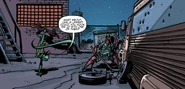 The other Mutanimals (Hob, Slash, Mondo Gecko, and Herman the Hermit Crab) arrive back at their headquarters after stealing the Foot Clan's supply of mutagen (see the TMNT ongoing series issue #43, Attack on Technodrome Part Three). Slash is wondering where Lindsey and Pete are but Hob tells him not to worry, Pete probably got distracted on their supply run. Hob then checks his messages and realizes that Lindsey and Pete have been kidnapped and are in danger. Hob orders the Mutanimals to move out, telling the others they can find Pete and Lindsey using the tracking device he planted on Pete. Mondo asks Hob if he planted tracking devices on all of them but Hob tells him not to be paranoid.