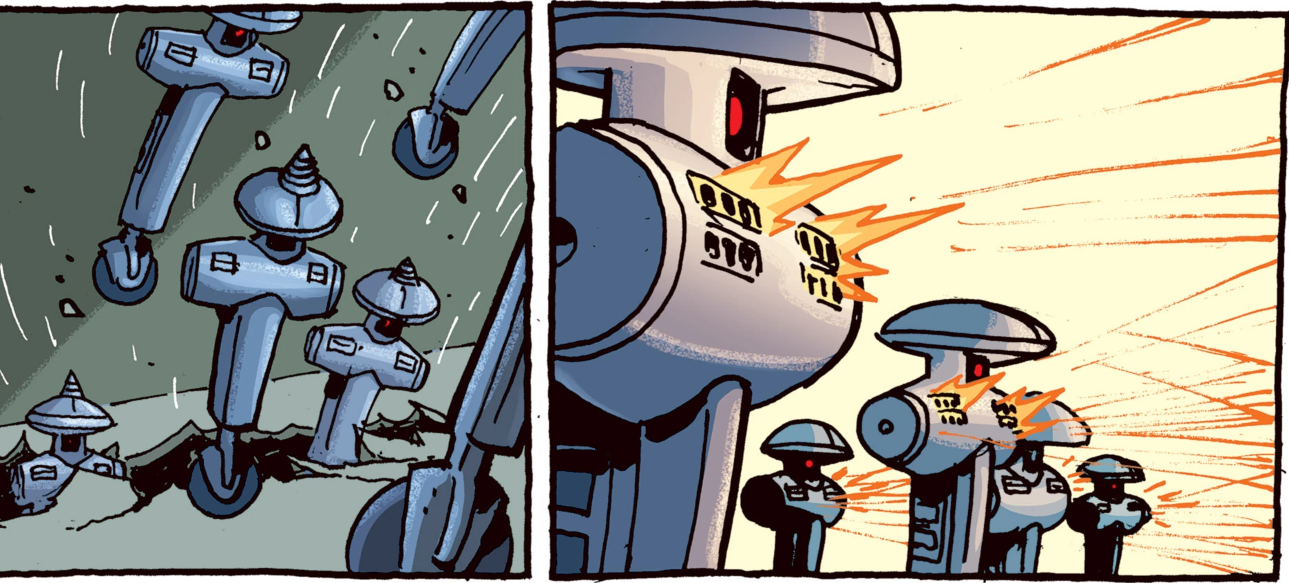 Upstairs, the Mutanimals hide behind Herman’s dumpster from cover fire laid down by Roadkill Rodneys—Null security robots. Pete attempts to pop off some shots from above the dumpster but is shot. Inside Null’s office, she tells Hob that it sounds like his backup has arrived. She tells him that she’d guessed at his plan and prepared for it, evacuating the building of everyone but herself and her Null bots. She tells Hob that there will be no next battle, at this is the end for him and the Mutanimals. Suddenly Null’s helicopter bursts through the wall, piloted by Sally. She leaps free as it crashes and takes out several robots. She grabs a gun and a makeshift helicopter blade sword and leads a charge against the remaining robots. Slash hulks out and takes out several of them while Herman guns down the rest. The others look on as Slash regains composure while in his berserker state.