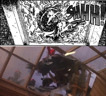 - The edge of the backdrop is visible when Shredder is running towards Splinter with his staff.