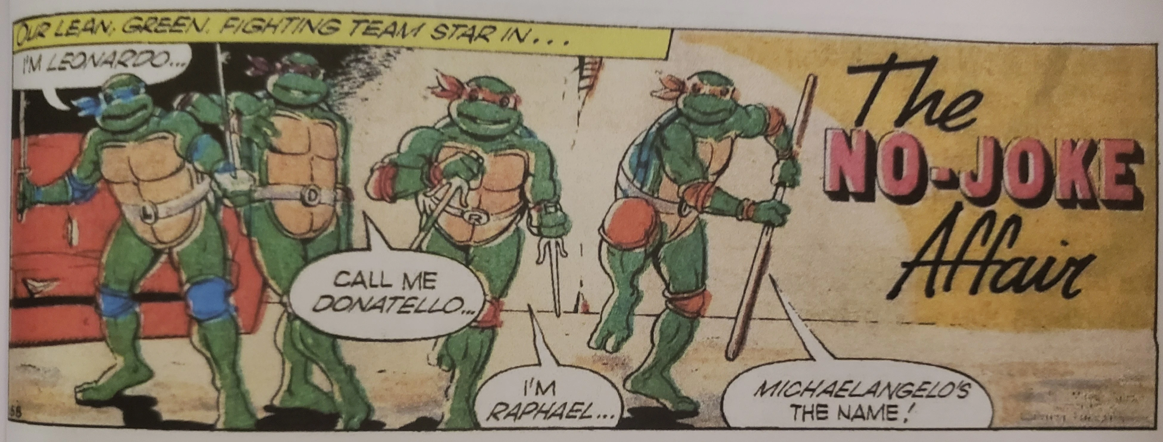 The No-Joke Affair is a Teenage Mutant Hero Turtles (comic strip), published in the Daily Mirror. This comic strip ran from October 29, 1990 to January 28, 1991 and were numbered 158 through 235.