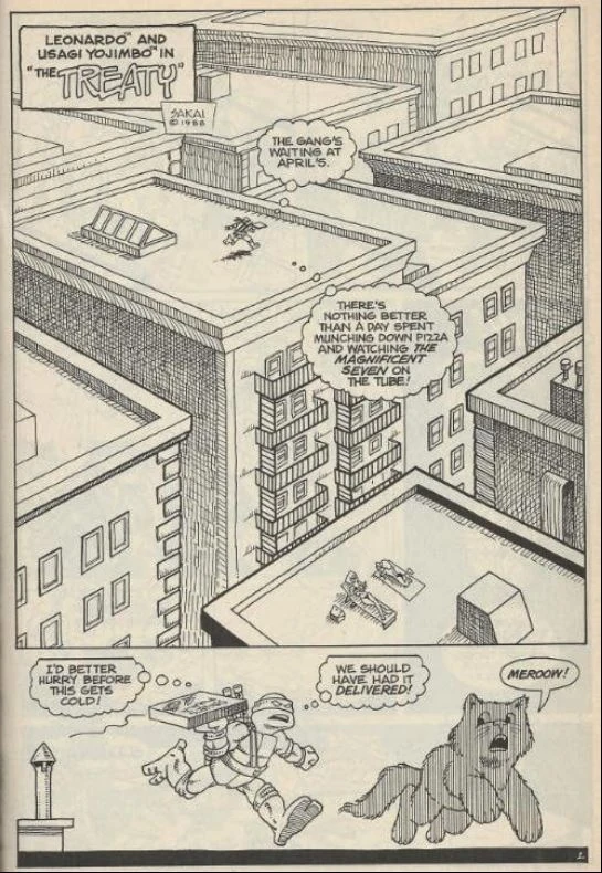 Leonardo is racing across the rooftops of New York, hoping to get back to April’s apartment with a fresh pizza before “The Magnificent Seven” is over. Unfortunately, he undergoes another one of the after-effects from his recent time/space adventures and finds himself zapped to the world of Usagi Yojimbo yet again.