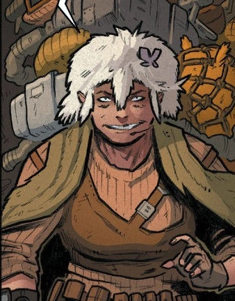 One day while Casey Marie is on a date and April is supposed to be watching her grandchildren, she instead brings them along with her on her black market shopping run. While she retains her attitude toward April, she is intrigued by these grandchildren (asking if Casey Marie married a "lizard") and connects with them (outside of Uno); Yi is enthralled by all of the tech in Tinker's shop, Moja loves Tinker's favorite movie, Tommy Boy, which is April's barter item that she brought on VHS, and when she finds out that Uno bullies Odyn by calling him fat, she says he's a big cuddly tank. She does attempt to connect to Uno by saying they can call her "Tinker Dos" when finding out his name, but only the girls find the joke amusing.