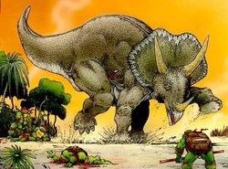 Triceratops was a genus of three-horned, quadrupedal herbivore dinosaurs that existed during the late Maastrichtian stage of Earth's Cretaceous period. It is one of the most well-known type of dinosaur in public consciousness, and thus has seen many appearances in media, including TMNT.