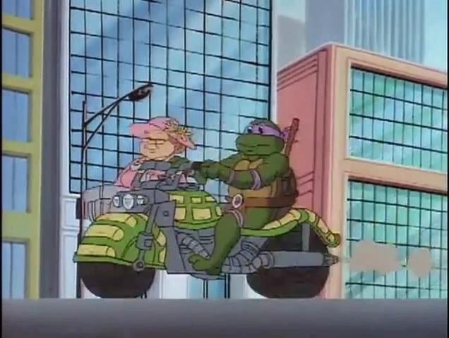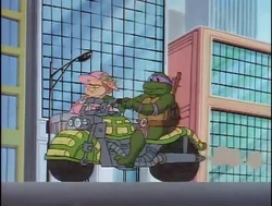 The Turtlecycle is a motorcycle with turtle shell detailing and a garbage can sidecar. It first appeared in Season 3 in just a few appearances and was one of the first Turtle vehicles that had no proper introduction into the series. Despite some slight aesthetic changes in color palette and detailing, it otherwise maintained its design from the vehicle in the original Playmates toyline.
