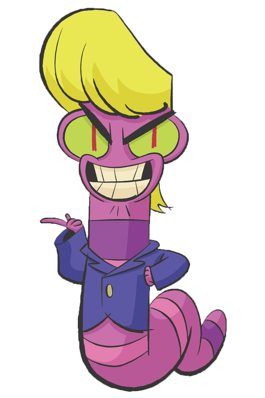 Warren Stone is a mutant earthworm with straight blonde hair styled in a pompadour, red eyes, thick black eyebrows, fuchsia skin with pink and purple stripes, and a diminutive stature. He wears a bright blue single-button blazer.