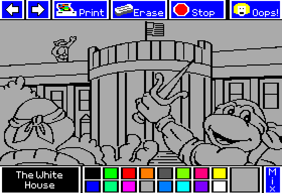 The Ninja Turtles visit the White House in Teenage Mutant Ninja Turtles: World Tour. Raphael and another Turtle pose outside the building, while a third Turtle stands on the roof.