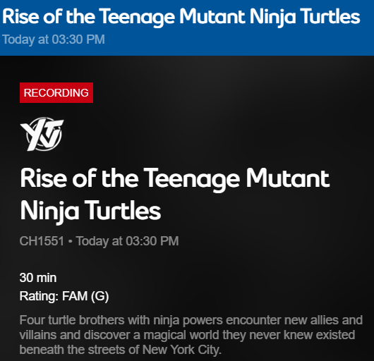 - Rise of the Teenage Mutant Ninja Turtles (2020, new episodes aired 3:30pm EST on Fridays, usually a week or more after the American debut on Nickelodeon)